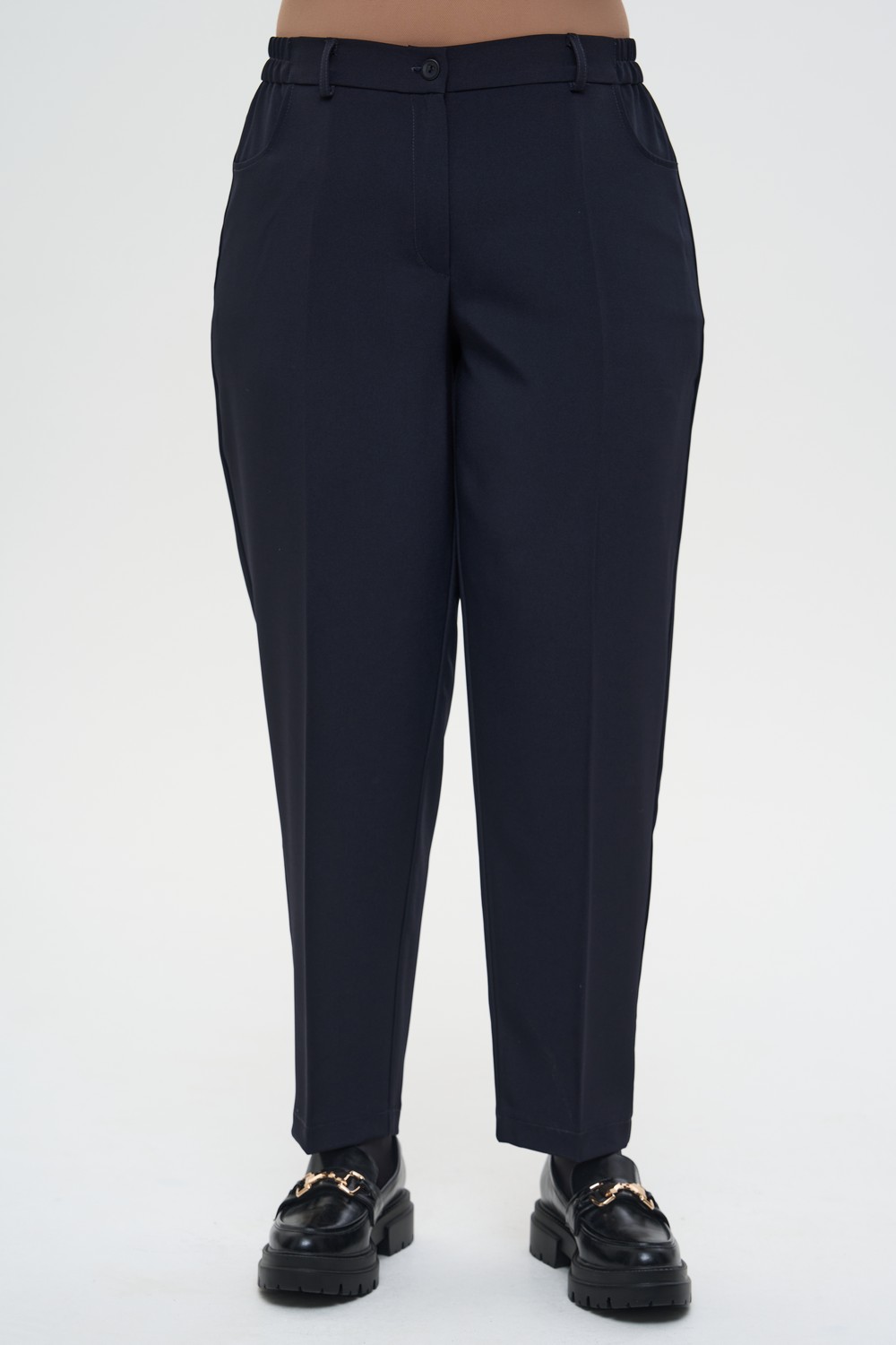 Женские темно-синие классические зауженные брюки ВЕСТЕРОС Интикома (Intikoma) - одежда для полных женщин. Пояс, частично выполненный на резинке, гарантирует идеальную посадку. Застежка на молнию в гульфике и пуговица на поясе обеспечивают надежную фиксацию, а шлевки позволяют дополнить образ стильным ремнем. Практичные карманы добавляют функциональности.