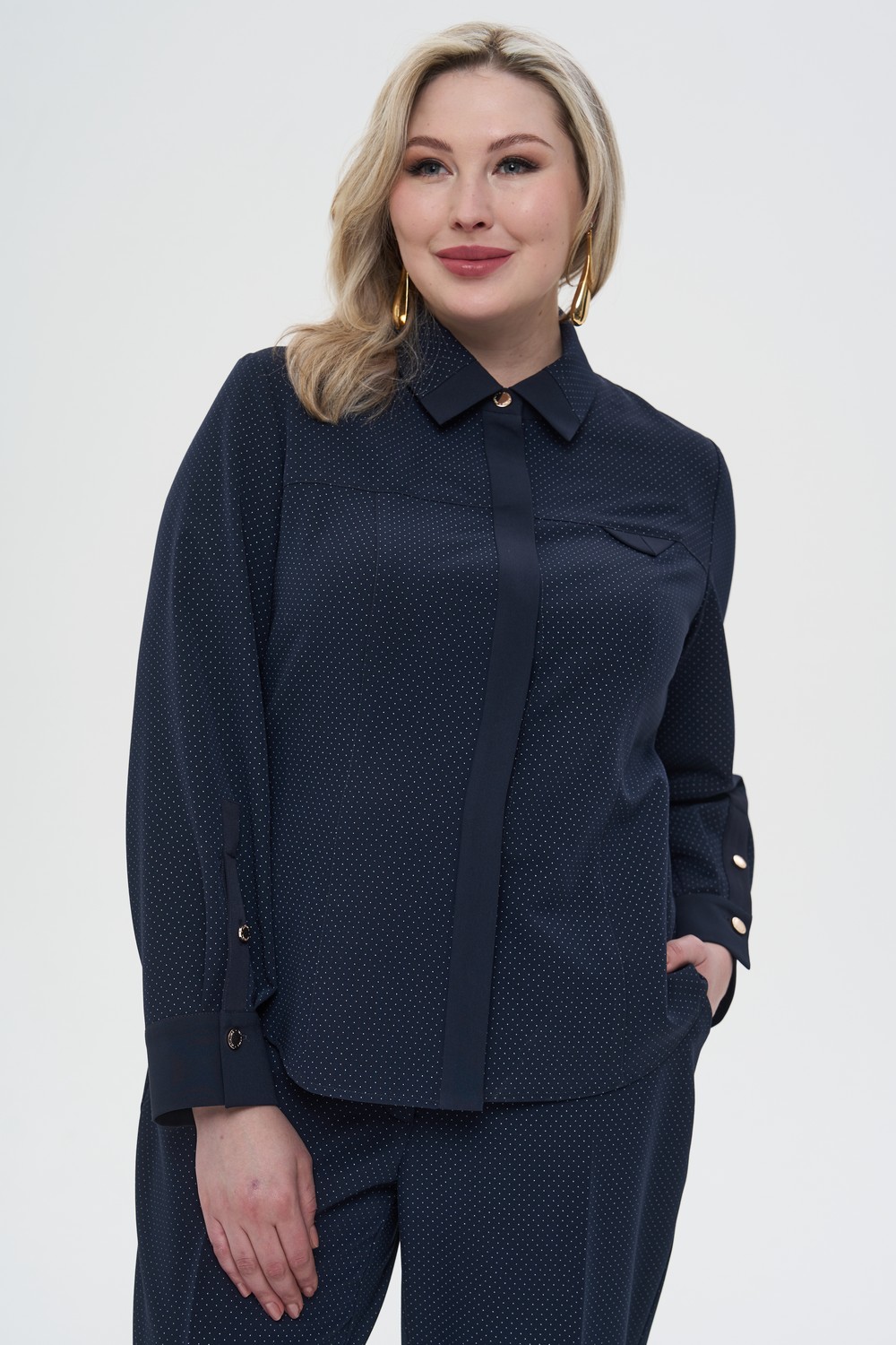 Женская темно-синяя с принтом блузка-рубашка ВИНТАЖ Интикома (Intikoma) - одежда для полных женщин