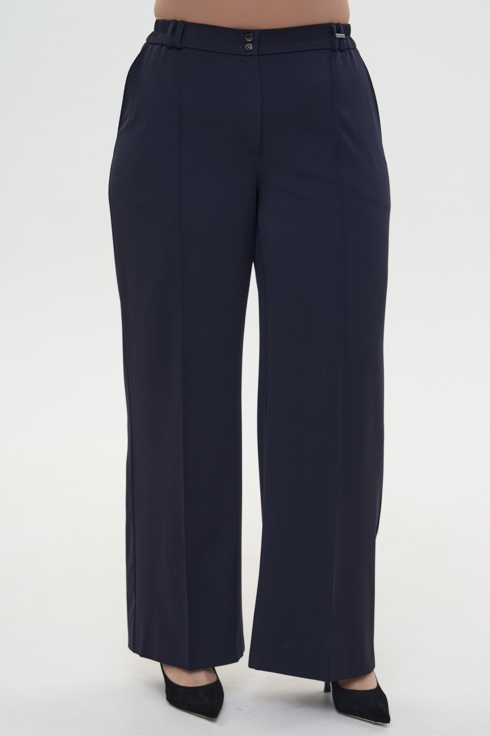 Женские темно-синие широкие прямые брюки ВОЛЬВО Интикома (Intikoma) - женская одежда больших размеров. Застежка гульфик с молнией, пуговицы на поясе. Пояс частично на резинке, гарантирует идеальную посадку по фигуре, есть шлевки которые позволяют дополнить образ стильным ремнем.