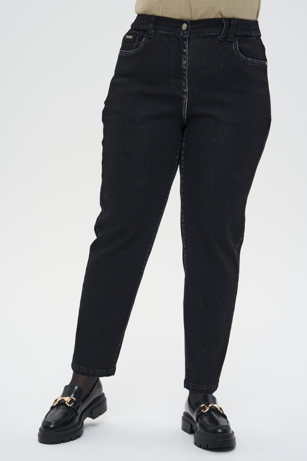 Женские черные прямые зауженные книзу джинсы АРКЕТ Интикома (intikoma) - женская одежда больших размеров. Пояс частично на резинке для удобной посадки, застежка гульфик на молнии пояс на пуговице, карманы по переду, по спинке кокетка и накладные карманы.