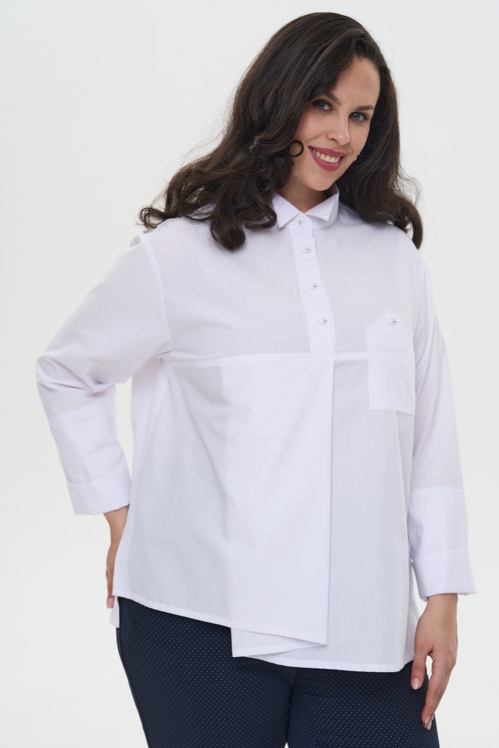 Женская свободная белая блузка ДЖОГИ Интикома (Intikoma) - женская одежда больших размеров. Свободная женская рубашка из воздушного хлопка. Спущенная линия плеча обеспечивает максимальный комфорт и свободу движений. Длинные рукава с отделкой позволяют самостоятельно регулировать длину. Ассиметричный низ, задумка по модели.