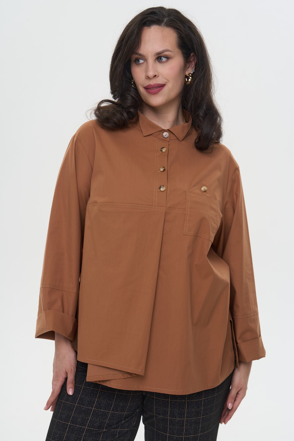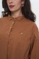 Женская свободная коричневая блузка ДЖОГИ Интикома (Intikoma) - женская одежда больших размеров. Свободная женская рубашка из воздушного хлопка. Спущенная линия плеча обеспечивает максимальный комфорт и свободу движений. Длинные рукава с отделкой позволяют самостоятельно регулировать длину. Ассиметричный низ, задумка по модели.