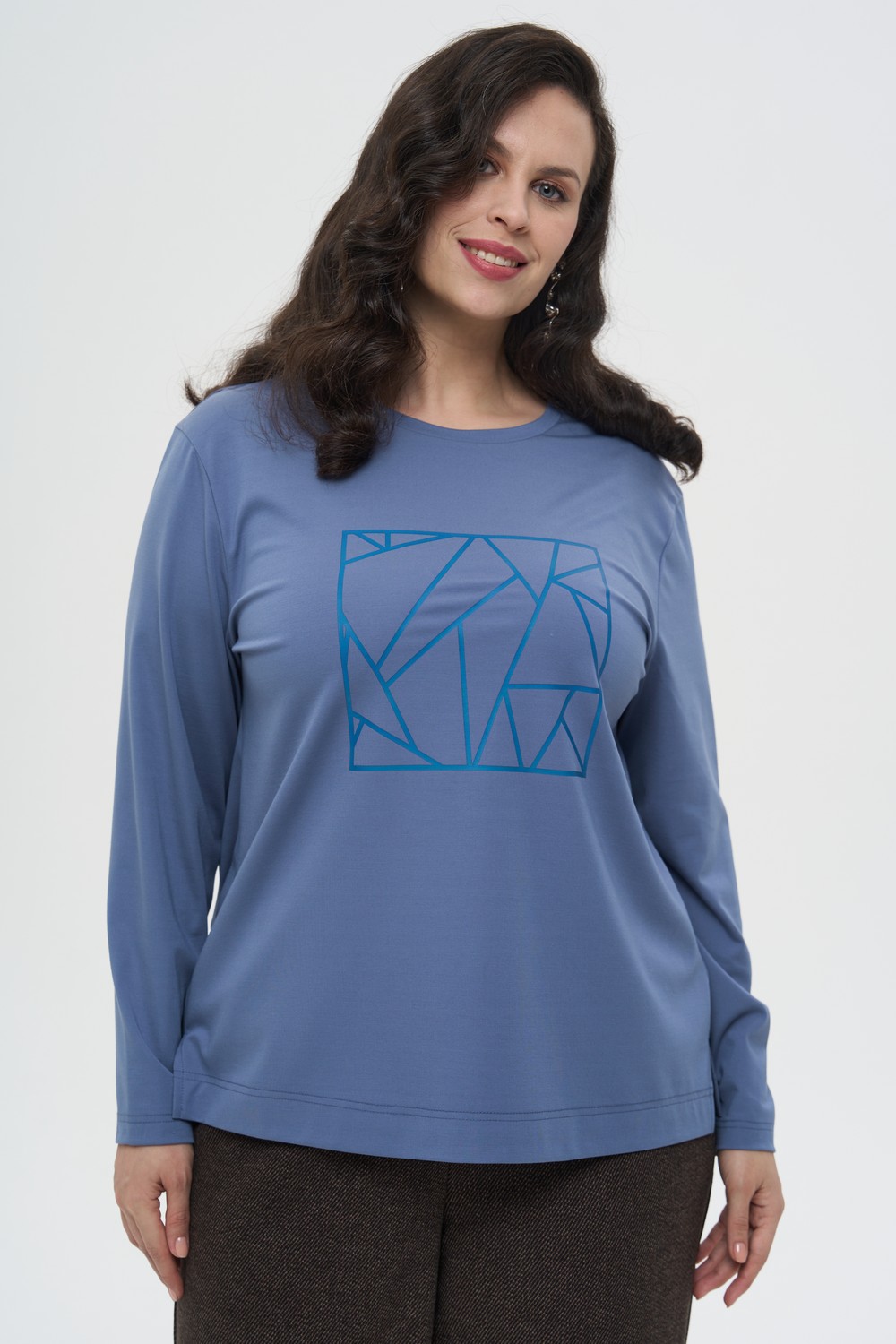 Женский синий с принтом лонгслив КВАДРО Интикома (Intikoma) - одежда для полных женщин. Джемпер прямого силуэта с разрезами в боковом шве, смотрится сдержанно и элегантно. Детали: прямой силуэт, длинный рукав. Округлая горловина с планкой.