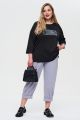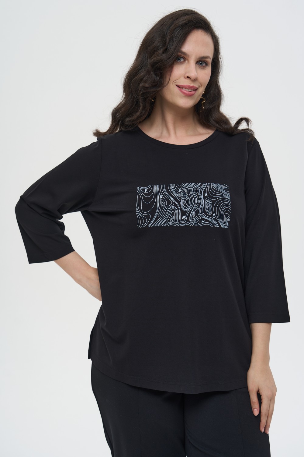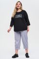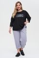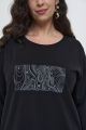 Женский черный с принтом трикотажный лонгслив СЕМУА Интикома (Intikoma) - одежда для полных женщин. Детали: прямой силуэт, спущенная линия плеча, длина рукава 3/4 , округлая горловина, по бокам разрезы.