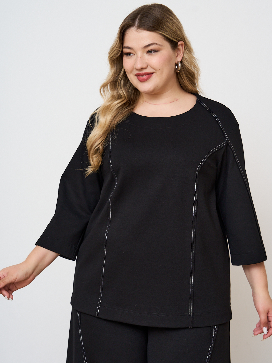 Женский черный джемпер ЗУРБАН Интикома (Intikoma) из плотного трикотажа - одежда для полных женщин. Этот джемпер с прямым кроем и укороченными рукавами. Контрастные отделочные строчки придают ритм джемперу. Плотный трикотаж, обеспечивая комфорт в течение всего дня. Джемпер легко комбинировать с рубашкой делая многослойный образ, который так актуален. Стильный комплект можно сорать с брюками ЗУРБАН 725528