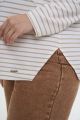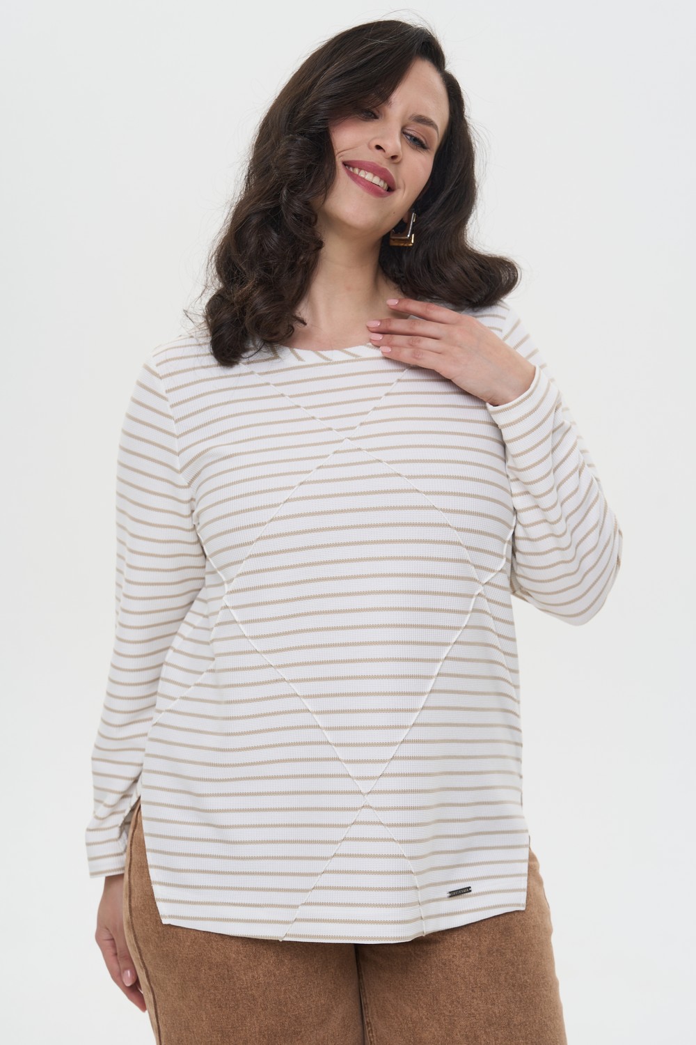 Женский трикотажный бежевый в полоску джемпер СЕЛИНДИОН Интикома (Intikoma) - женская одежда больших размеров. Прямой силуэт, длинный втачной рукав, фигурные разрезы в боковых швах, округлая горловина с планкой.