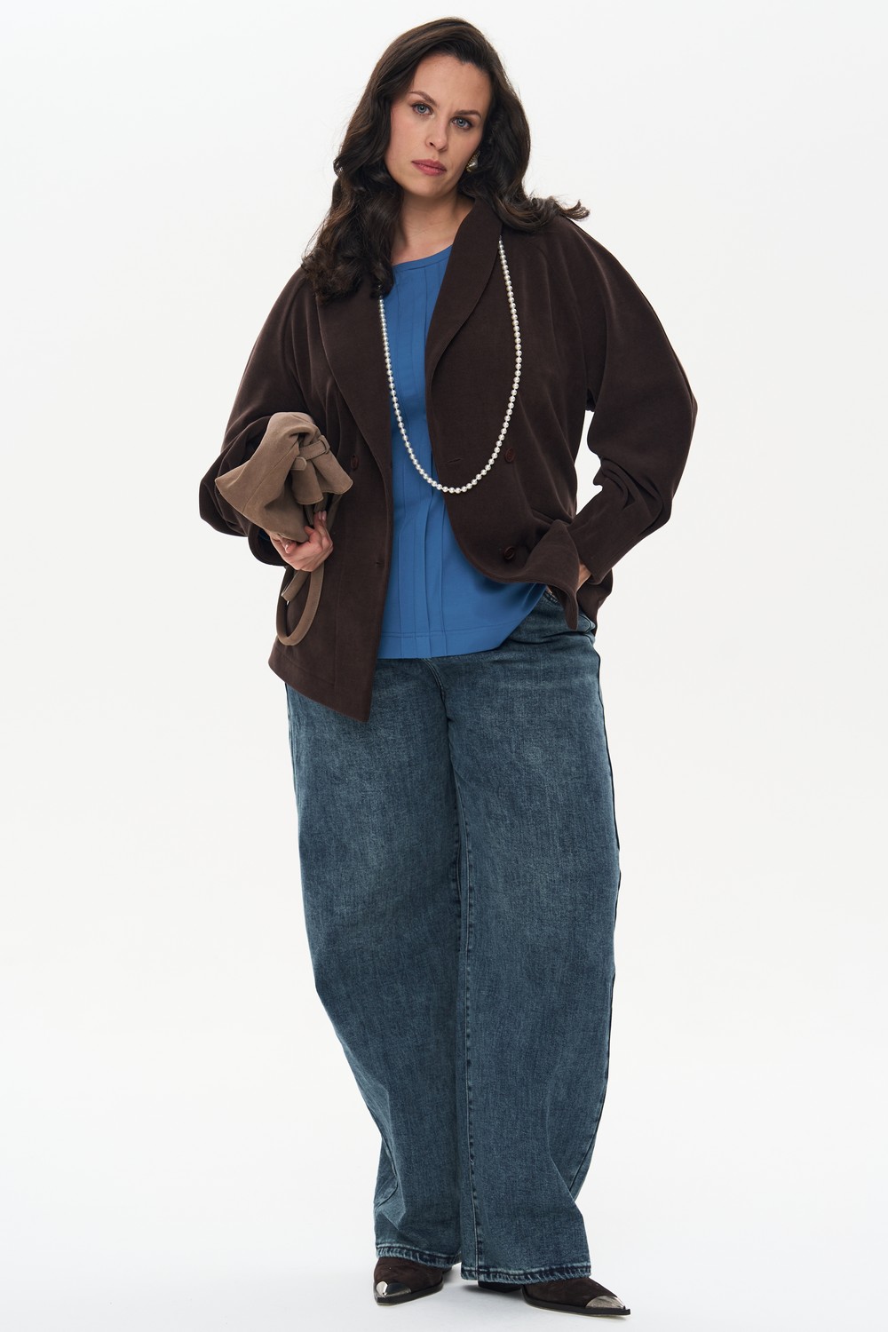Женские синие широкие джинсы-багги СПИНЧ Интикома (Intikoma) - женская одежда больших размеров. Свободные сверху, плавно сужаются книзу, создавая актуальный силуэт. Эффектная варка придает джинсам винтажный вид. Пояс без резинки, застежка на молнию в гульфике, карманы по переду, по спинке кокетка и накладные карманы.