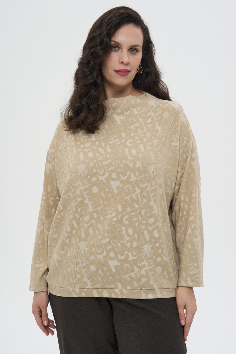 Женский бежевый с жаккардовым принтом джемпер БЕВЕРЛИ Интикома (Intikoma) - одежда для полных женщин. Теплый, приятный к телу материал согреет Вас в прохладную погоду. Джемпер свободного кроя. Длинные рукава, воротник хомут, защипы по переду придают динамики образу. Низ спинки по низу оформлен резинкой для создания модного силуэта.
