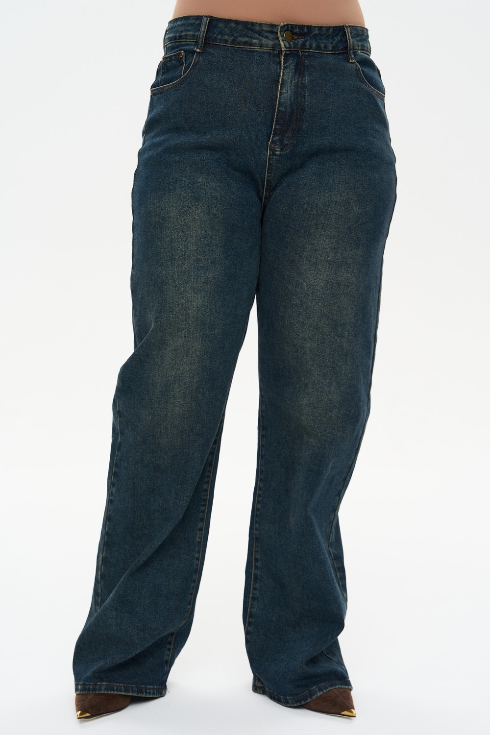 Женские прямые широкие сине-зеленые джинсы ДЖИДЖИ Интикома (Intikoma) - одежда для полных женщин. Полная длина джинсов визуально вытягивает силуэт, делая ноги бесконечно длинными. Пояс без резинки, застежка молния в гульфике, карманы по переду, по спинке кокетка и накладные карманы. Выполнены из плотной джинсы с небольшим добавлением эластана.