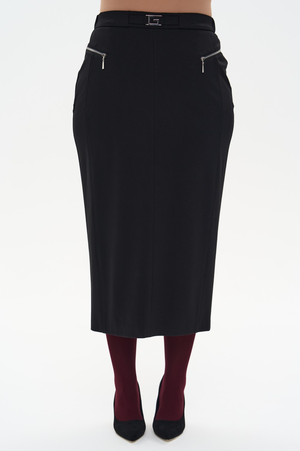 Женская черная трикотажная юбка-карандаш МАДАМ бренда Интикома (Intikoma) - одежда для полный женщин. Изделие обладает высокой посадкой, благодаря чему визуально вытягивает силуэт и создает эффект бесконечных ног. Талия частично на эластичном поясе, поэтому юбка легко подстраивается под Ваши объемы и параметры. Застежка сзади на потайную молнию и пуговицу. Имеется шлица в среднем шве спинки. Модель без подкладки.