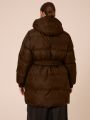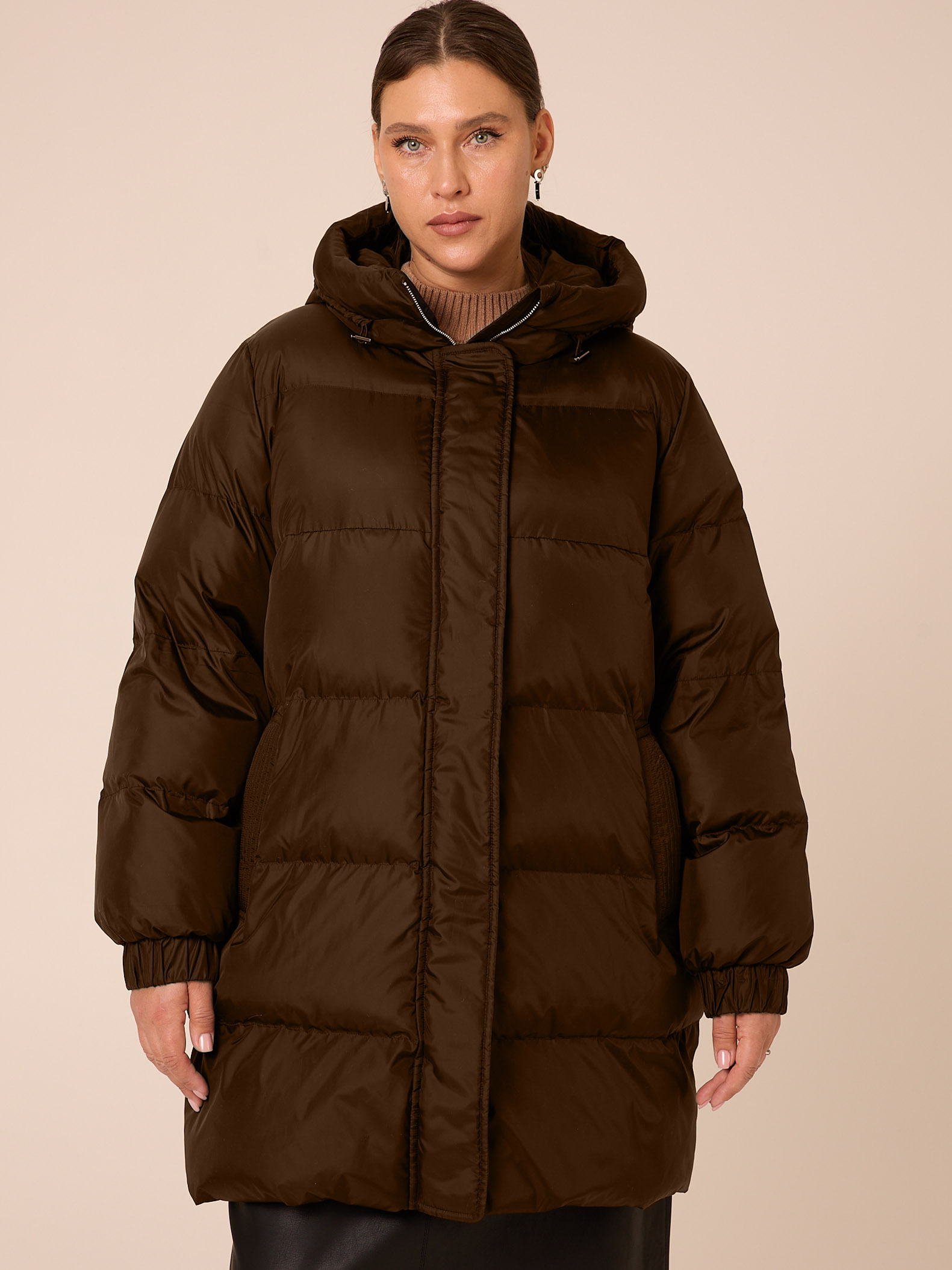 Женская коричневая зимняя куртка ANORA бренда Modress (Модресс) - женская одежда больших размеров. Куртка свободного прямого кроя с поясом, длиной до середины бедра. Капюшон втачной с кулиской. Плечевой пояс немного спущен. Низ рукавов собран на притачные манжеты с эластичной тесьмой внутри. Боковые карманы прорезные с листочками. Есть внутренний накладной карман на подкладке. Изделие застегивается на металлическую молнию, которая закрыта ветрозащитной планкой. Куртка выполнена из плащевой ткани с водоотталкивающими свойствами.