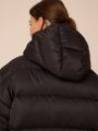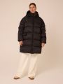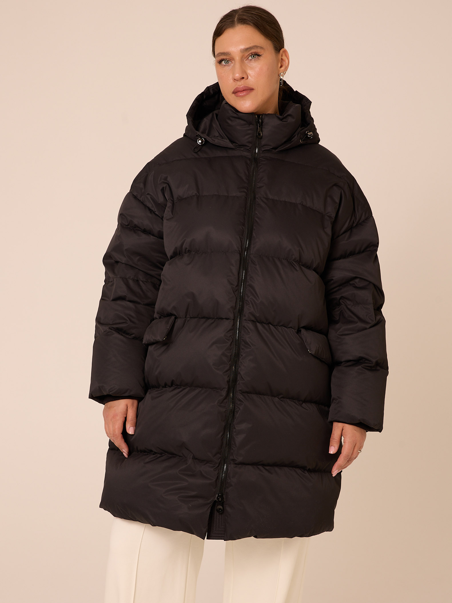 Женская черная зимняя пуховая куртка GABRIEL бренда Modress (Модресс) - одежда для полных женщин. Куртка свободного прямого кроя, длиной до колен. Воротник-пухлая стойка, капюшон съемный, пристегивается к воротнику на кнопки. Плечевой пояс спущен. Рукава выполнены с трикотажными манжетами-напульсниками внутри. Боковые карманы с клапанами, выполнены в горизонтальном подрезе. Есть внутренний накладной карман на подкладке. Изделие застегивается на широкую, тракторную молнию. По низу изделия выполнена кулиска с регулируемой резинкой.