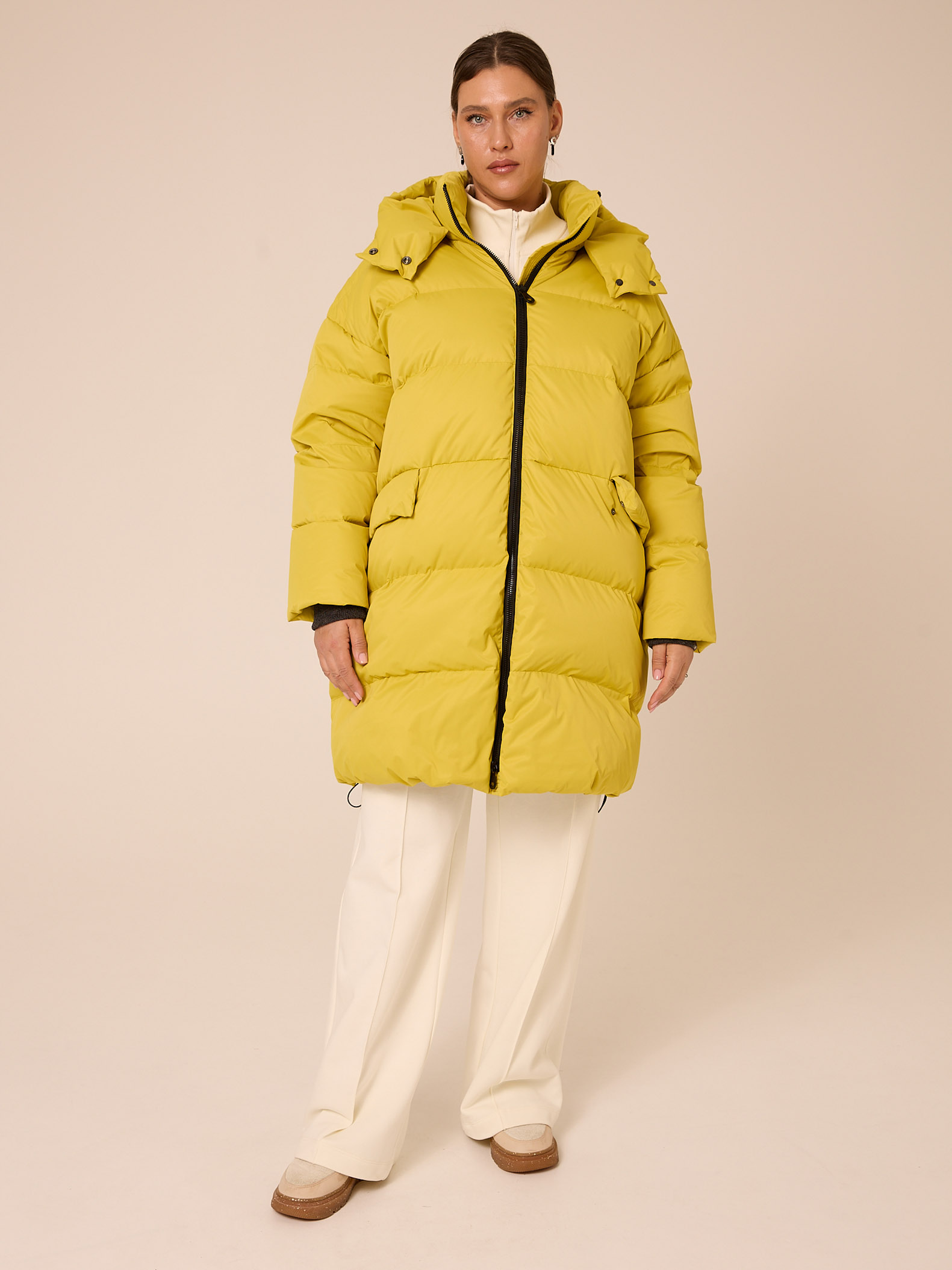 Описание: Женская желтая зимняя пуховая куртка GABRIEL бренда Modress (Модресс) - одежда для полных женщин. Куртка свободного прямого кроя, длиной до колен. Воротник-пухлая стойка, капюшон съемный, пристегивается к воротнику на кнопки. Плечевой пояс спущен. Рукава выполнены с трикотажными манжетами-напульсниками внутри. Боковые карманы с клапанами, выполнены в горизонтальном подрезе. Есть внутренний накладной карман на подкладке. Изделие застегивается на широкую, тракторную молнию. По низу изделия выполнена кулиска с регулируемой резинкой.