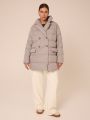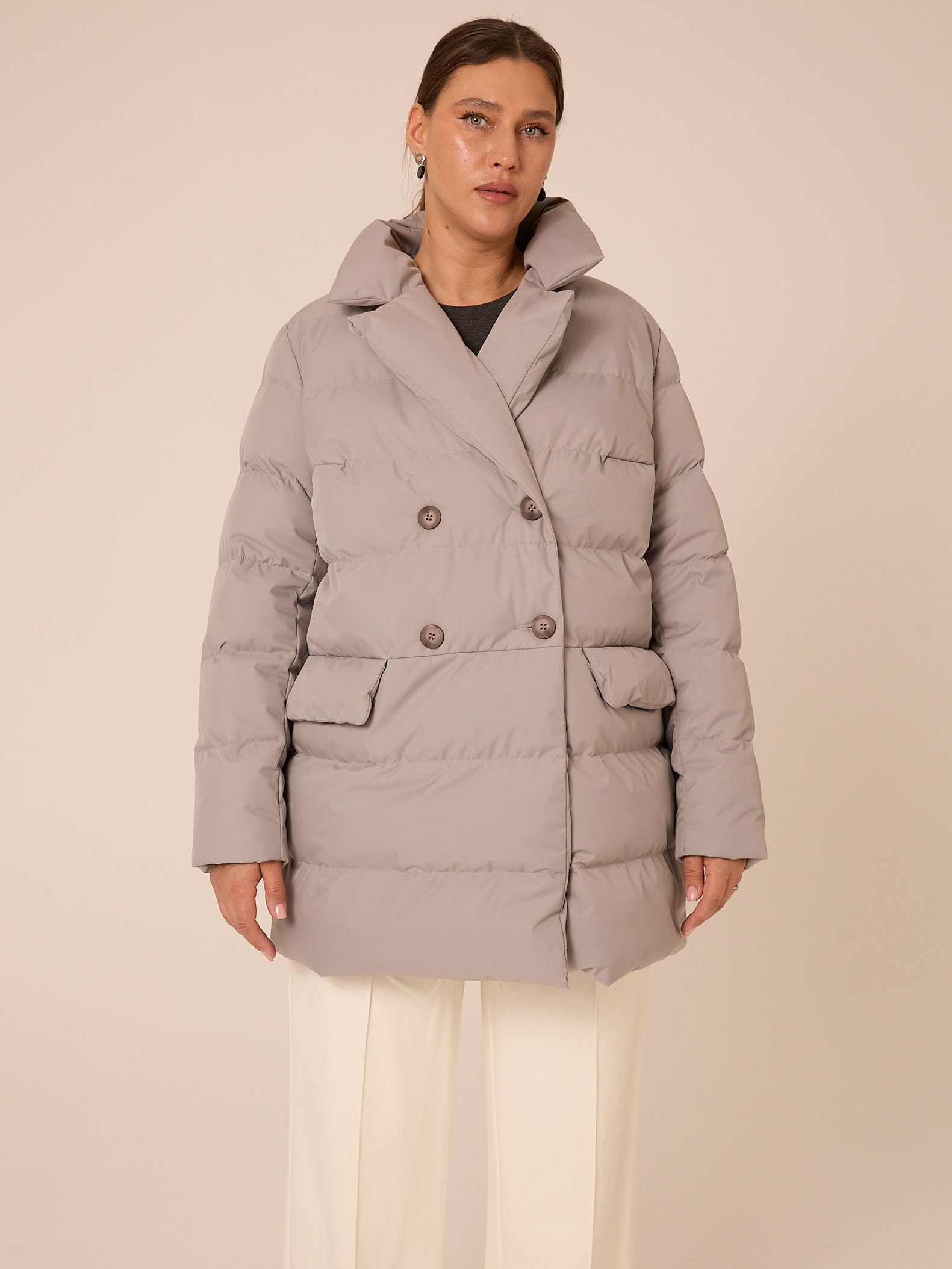 Женская светло-серая пуховая куртка еровзима LUI бренда Modress (Модресс) - одежда для полных женщин. Куртка прямого кроя, длиной ниже линии бедер. Плечевой пояс немного спущен. Воротник типа английского, с лацканами, застегивается до верха. Рукава двухшовные. Боковые карманы с клапанами, выполнены в горизонтальном подрезе. Нагрудная вытачка обеспечит хорошую посадку. Есть внутренний накладной карман на подкладке. Куртка двубортная, застегивается на петли и пуговицы и дополнительные потайные кнопки.