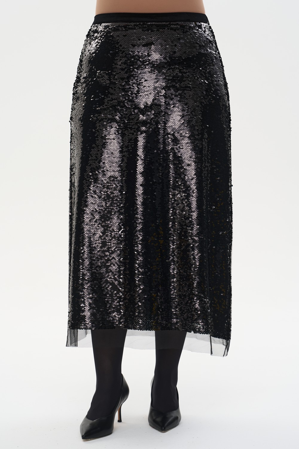Женская черная нарядная юбка с пайетками большого размера ЛАУРА бренда Intikoma (Интикома) артикул 725805 - женская одежда больших размеров. Нарядная юбка длины миди прямого покроя выполнена из ткани пайетки. Модель на притачном поясе частично на резинке. Без застежки. Юбка на подкладке.