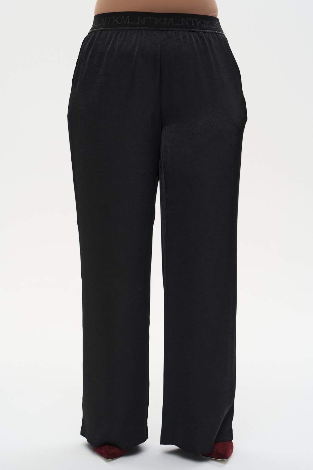 Женские черные атласные брюки большого размера АЛИЗЕ бренда Intikoma (Интикома) артикул 725801 - женская одежда больших размеров. Женские брюки-палаццо свободного силуэта, без застежки выполнены из комфортной ткани с креш-эффектом. Эластичный пояс с логотипом бренда обеспечивает удобную посадку. В боковых швах функциональные карманы. Стильный комплект можно собрать с блузкой КЮИ арт. 825809