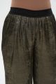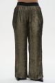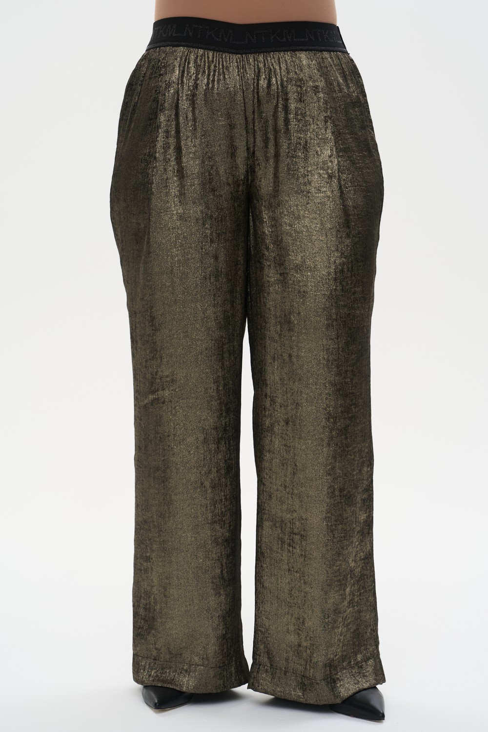 Женские нарядные золотые брюки ШУМАН большого размера от бренда Intikoma (Интикома) артикул 725803 - женская одежда больших размеров. Женские брюки-палаццо свободного силуэта, без застежки. Эластичный пояс с логотипом бренда обеспечивает удобную посадку. Мягкая вискозная ткань с деликатным сиянием и гладкой внутренней стороной. высокая посадка. Ширина штанины внизу – 32 см. Стильный образ можно собрать с блузкой БЛЕСК арт. 825807