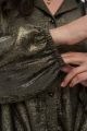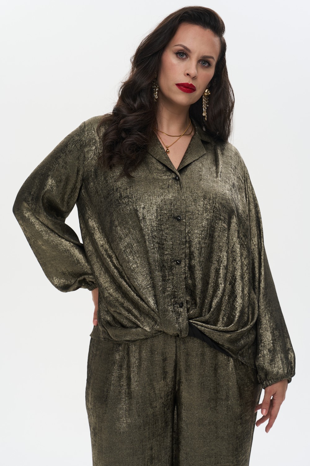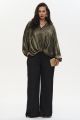 Женская нарядная золотая блузка БЛЕСК большого размера бренда Intikoma (Интикома) артикул 825807 - одежда для полных женщин. Блузка свободного силуэта с центральной застежкой на пуговицы по переду, отложной воротник. Нижняя часть переда оформлена декоративным узлом. Спинка с отрезной кокеткой и встречной складкой. Спинка изделия длиннее, чем перед. Рукава втачные длинные, с резинкой по низу. Плечевой шов слегка опущен. Стильный комплект ожно собрать с брюками БЛЕСК арт. 725803