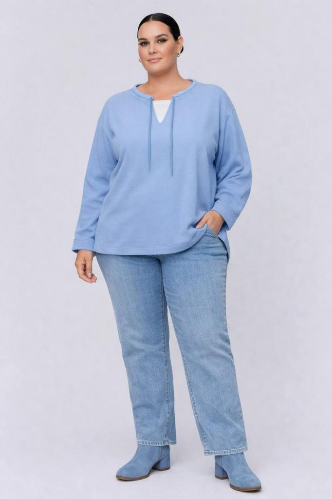 Женский голубой в полоску свитшот большого размера МОНРЕАЛЬ ВК26-010 от бренда Terra (Терра) - женская одежда большого размеры. Свитшот в полоску!!! Мягкий плотный трикотаж, ткань держит форму, приятна к телу и комфортна в носке. Свободный крой, ничего не тянет и не перегружает фигуру. Светлая вставка у выреза со шнурком освежает лицо и делает образ более легким. Свитшот хорошо сочетается с джинсами и брюками.