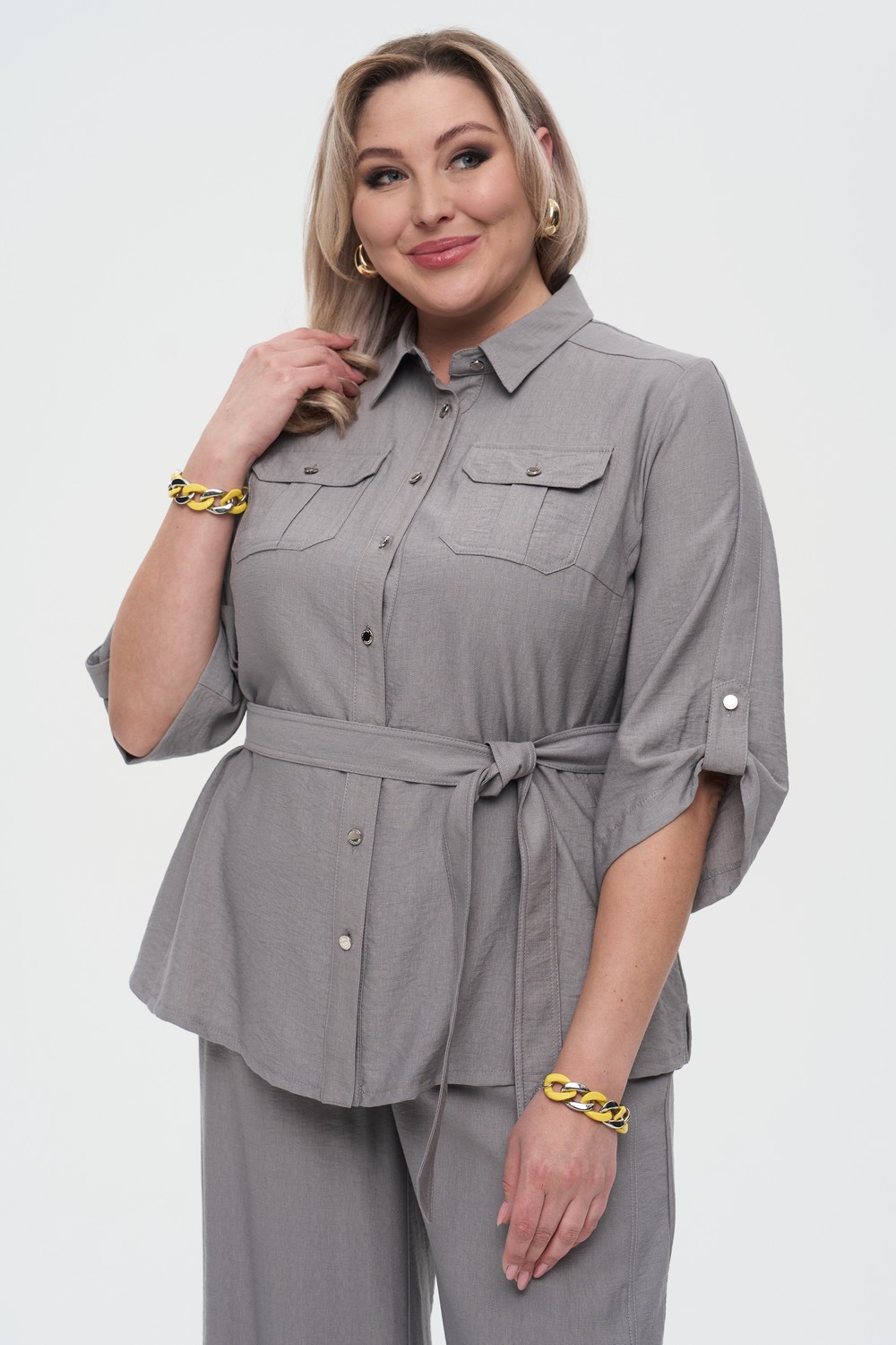 Женская серая свободная рубашка большого размера САТОРИ артикул 826038 бренда Intikoma (Интикома) - одежда для полных женщин. Рубашка свободного силуэта в стиле сафари. Модель выполнена из мягкого смесового полотна с характерной жатой фактурой, которая обеспечивает комфорт в жаркую погоду и практичность в уходе. Стильный комплект можно собрать с брюками ТОРИЖ артикул 726026