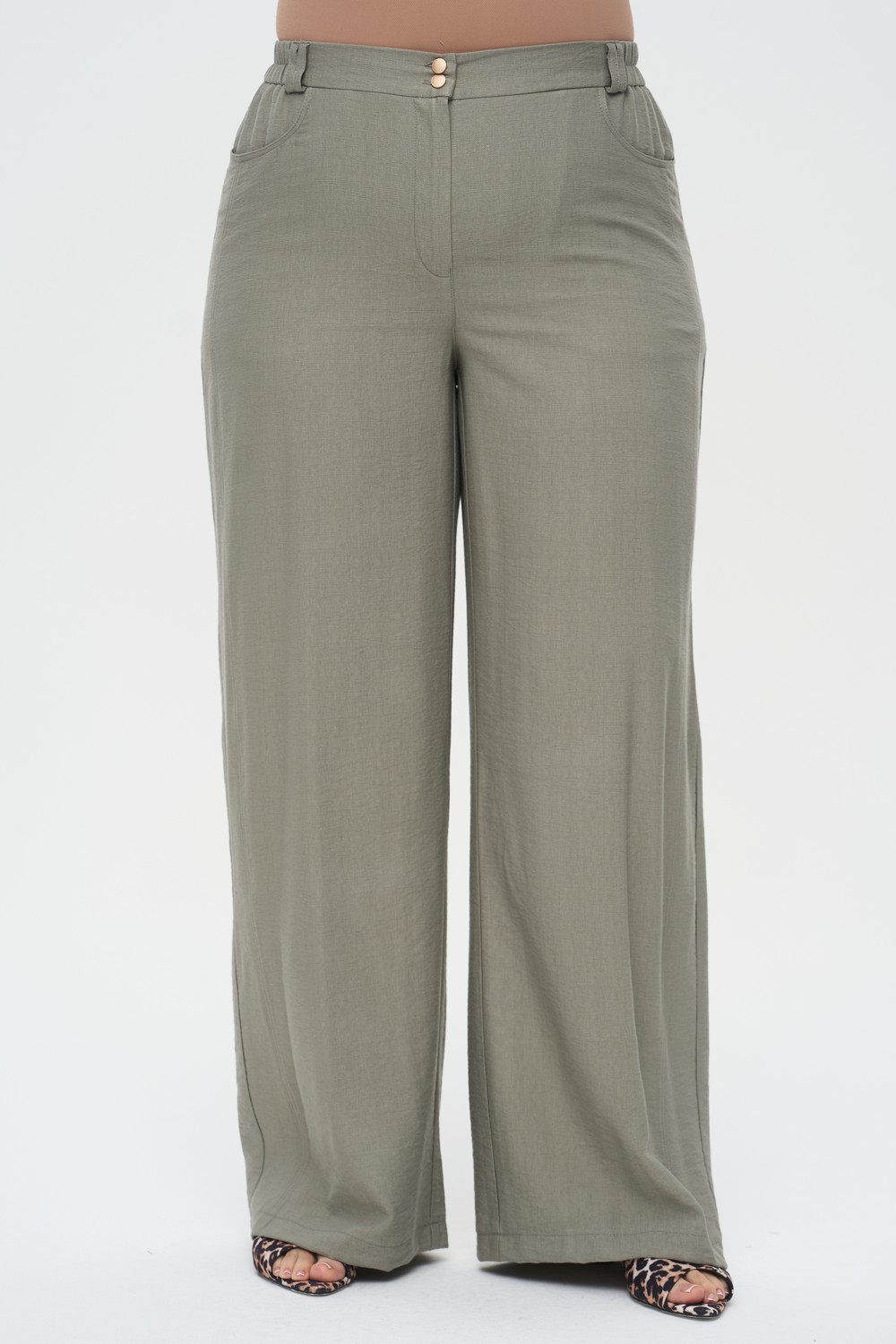 Женские широкие брюки-палаццо ТОРИЖ артикул 726026 в цвете хаки бренда Intikoma (Интикома) - одежда для полных женщин. Модель выполнена из мягкого смесового полотна с благородной жатой фактурой, которая придает изделию современный вид и делает его практичным в повседневной носке. Брюки идеально гармонируют с блузой «Татика» с цветочным принтом артикул 826018 или лаконичным жакетом САТОРИ артикул 826038, формируя стильный и завершенный костюмный образ.