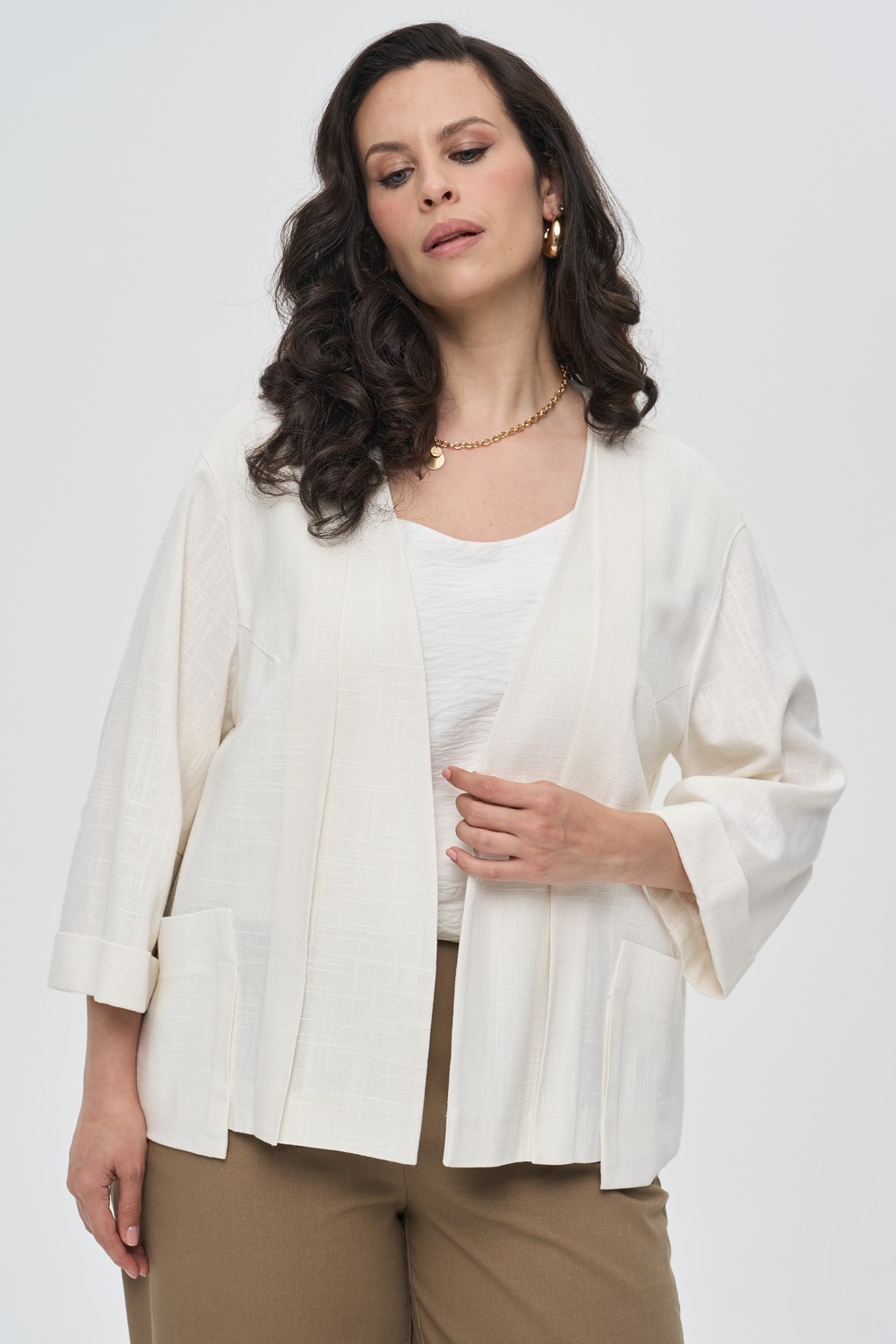 Женский молочный жакет большого размера АЙВОРИ артикул 526010 бренда Intikoma (Интикома) - одежда для полных женщин. Жакет прямого силуэта выполнен из 100% льна. Модель без застежки с мягкой линией плеча идеально подходит для создания многослойных летних образов. Втачной рукав длиной 3/4, что подчеркивает изящность запястий и делает модель более легкой.