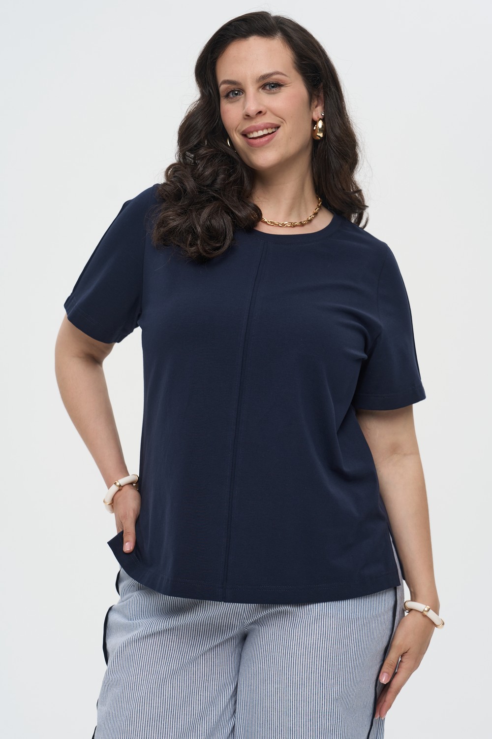 Женская синяя базовая трикотажная футболка большого размера СТРОНГ артикул 226008 бренда Intikoma (Интикома) - одежда для полных женщин. Футболка прямого силуэта выполнена из мягкого и эластичного трикотажного полотна. Отлично подходит для создания многослойных образом