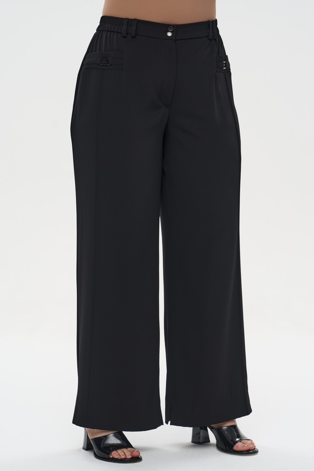 Женские черные широкие брюки-палаццо большого размера БЕНЕФИС артикул 726019 бренда Intikoma (Интикома). Модель выполнена из качественного смесового полотна. Брюки универсальны в стилизации.