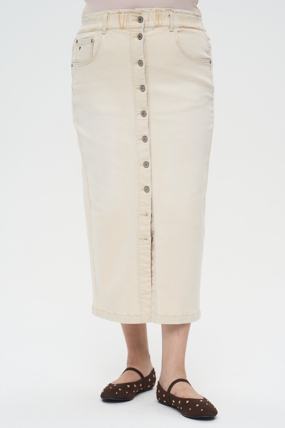 Женская бежевая юбка из хлопка большого размера САРАДЖЕС артикул 926010 бренда Intikoma (Интикома). Сквозная центральная застежка на пуговицы по всей длине переднего полотнища добавляет модели актуальный акцент и позволяет регулировать высоту разреза по низу. Четкие вертикальные линии кроя и ряд пуговиц визуально вытягивают силуэт.