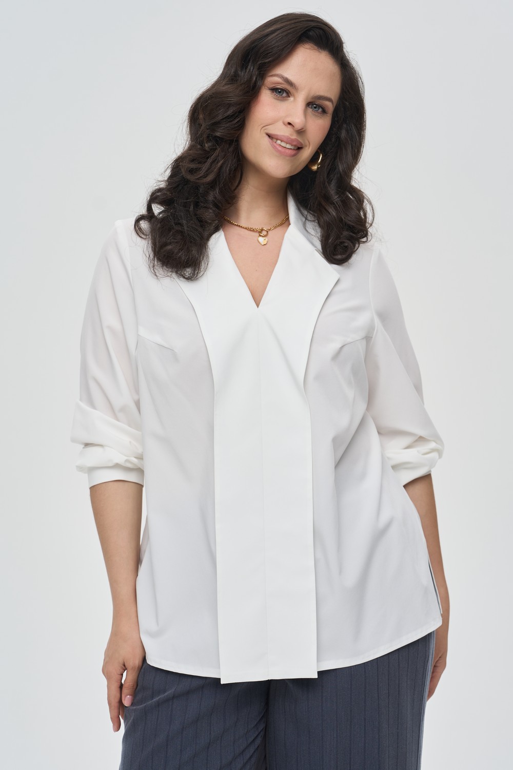 Женская белая блузка большого размера СОЛЕТТО артикул 826045 бренда Intikoma (Интикома) - одежда для полных женщин. Модель выполнена из мягкого смесового полотна. Блузка свободного прямого кроя с удлиненной спинкой, свободный рукав длиной три четверти.