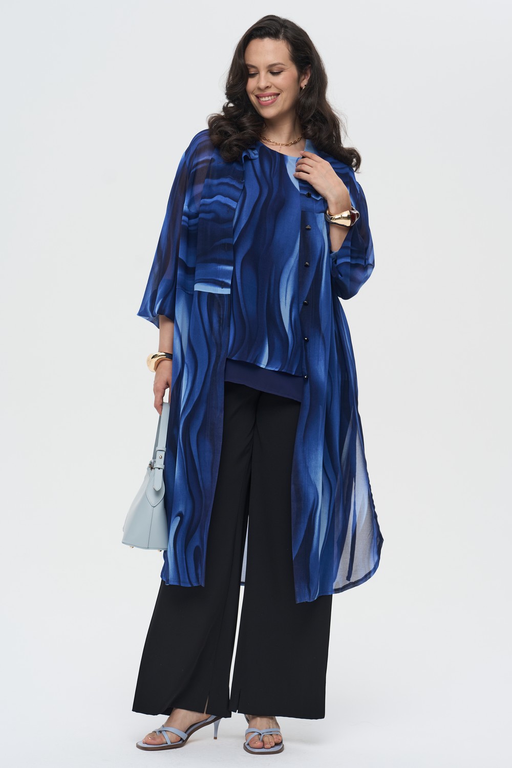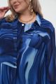 Женская удлиненная синяя рубашка с принтом волна большого размера ВОЛНА артикул 826022 бренда Intikoma (Интикома) - женская одеждда plus size. Модель выполнена из легкого струящегося полотна. Стильный комплект можно собрать с топом ВОЛЬГА артикул 226018