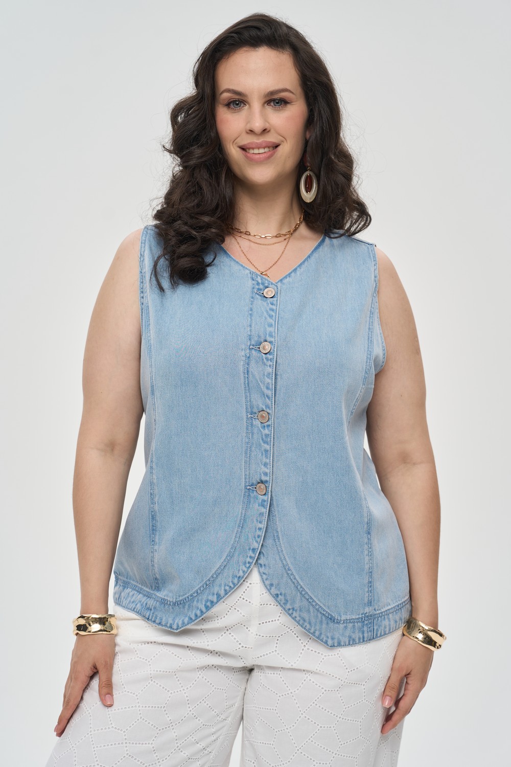 Женский голубой джинсовый жилет большого размера БЛУИ артикул 926004 бренда Intikoma (Интикома) - женская одежда plus size. Приталенный крой с рельефными швами. Застежка- центральная планка на пуговицах по всей длине изделия. Стильный образ можно собрать с джинсами МОРИСОЛЬ артикул 926006