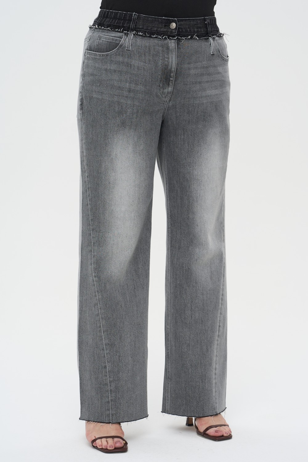 Женские серые широкие джинсы большого размера ХИПХОПЫ артикул 926011 бренда Intikoma (Интикома) - одежда для полных женщин. Свободный крой Wide Leg с широкими штанинами от бедра, создающий актуальный объемный силуэт. Стандартная посадка на талии с поясом на пуговице и шлевками для ремня. Необработанный срез с легкой бахромой придает модели непринужденный вид.