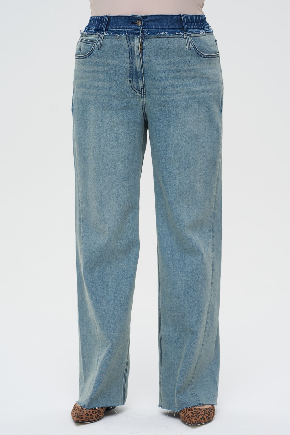Женские голубые широкие джинсы большого размера ХИПХОПЫ артикул 926011 бренда Intikoma (Интикома) - одежда для полных женщин. Свободный крой Wide Leg с широкими штанинами от бедра, создающий актуальный объемный силуэт. Стандартная посадка на талии с поясом на пуговице и шлевками для ремня. Необработанный срез с легкой бахромой придает модели непринужденный вид.
