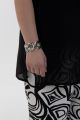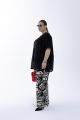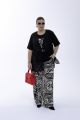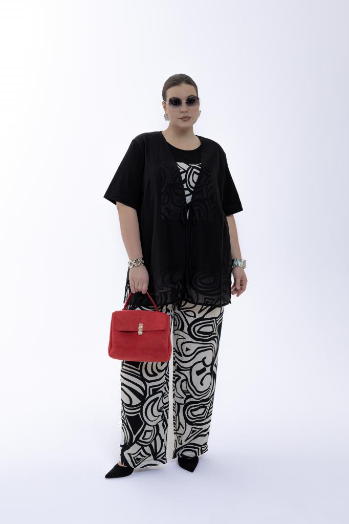 Женский черный с принтом летний костюм-двойка большого размера БУЛЬВАР артикул ВК26-017 бренда Terra (Терра) - женская одежда plus size. Футболка соединена с легкой накидкой и составляет единой целое. Брюки с графическим принтом, узор перекликается с узором на футболке. Брюки на резинке прямые свободные. Получается красивый многослойный образ без тяжести и скованности. Часть блузы выполнена из ткани: вискоза и шелк. Преимущества костюма - надели и сразу образ получается завершенным, интересным и презентабельным. При этом не жарко и очень удобно.