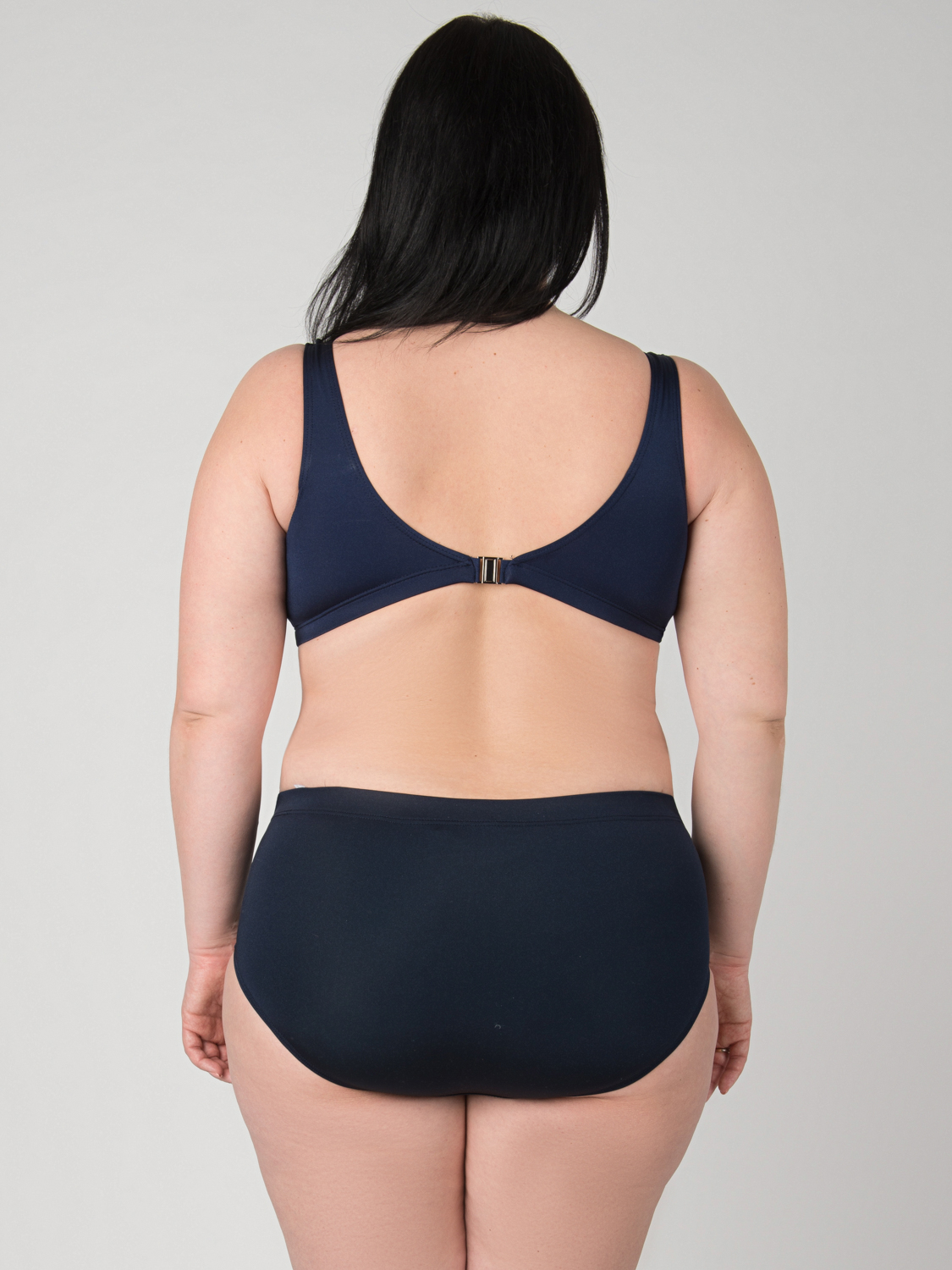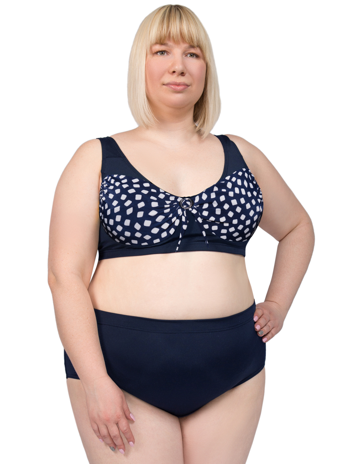 Женский раздельный темно-синий купальник большого размера на рост 172 см, чашка CD. Плавки классические слипы с высокой посадкой, корректирующие фигуру. Лиф с каркасами и получашечками,обеспечивающими поддержку груди, на подкладке, с драпировкой позволяющей регулировать размер чашек.Лямки широкие 3 см.,укрепленные,не регулируются. Данная модель не рекомендуется при наличии фартука