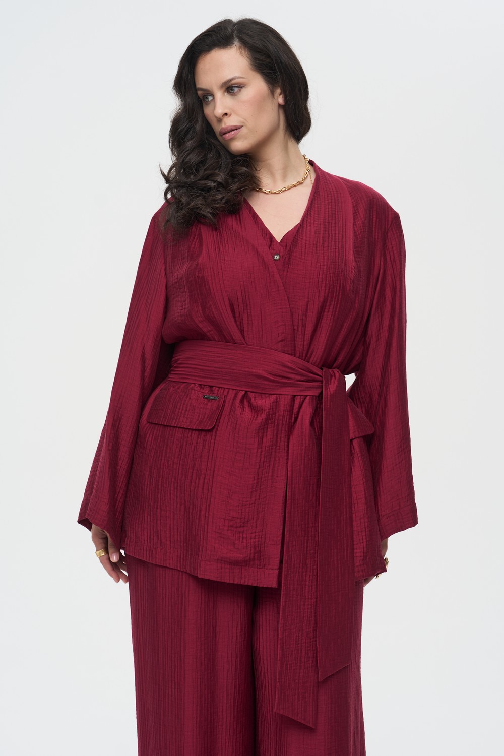 Женский бордовый удлиненный жакет-накидка в стиле кимоно КАЛАБРИЯ артикул 526007 большого размера от бренда Интикома (Intikoma) - одежда для полных женщин. Модель выполнена из легкого смесового полотна с выразительной жатой фактурой. Застежка отсутствует — жакет предназначен для ношения нараспашку, что создает вертикальные линии и визуально вытягивает силуэт. Отлично сочетается с топом АСТИ артикул 226019 и брюками РИБЕЙРО артикул 726024