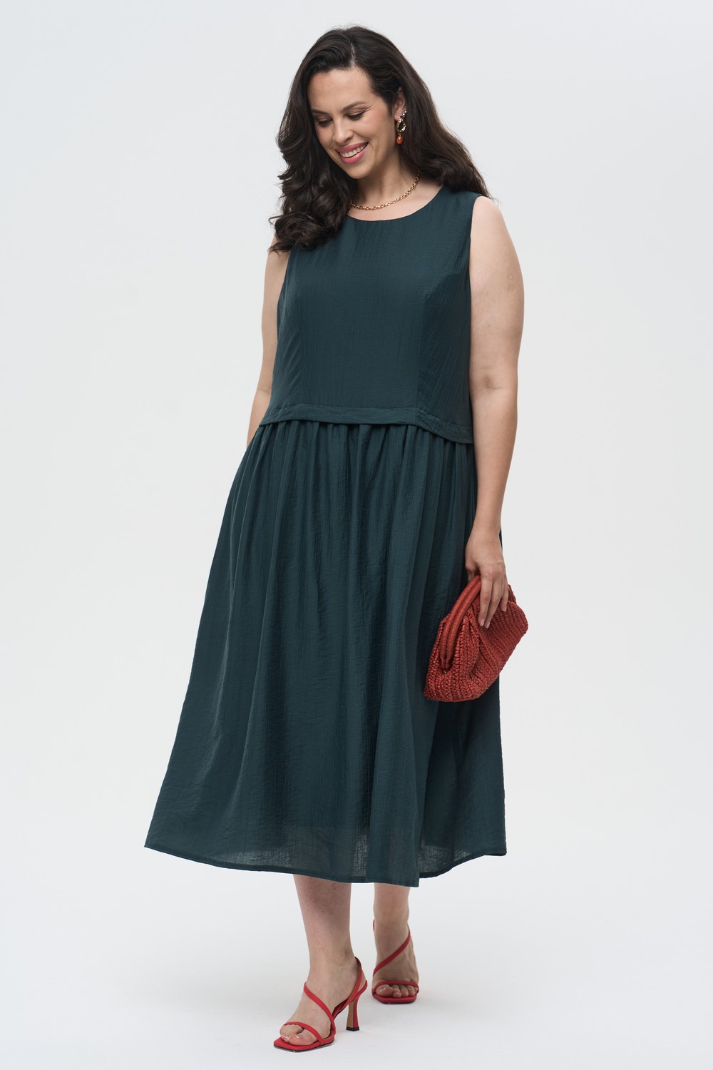 Описание: Женское изумрудное миди платье АЛЛЕГОРИЯ большого размера артикул 426029 бренда Интикома (Intikoma) - женская одежда plus size. Ткань обладает деликатной жатой фактурой. Силуэт приталенный, с плавно расширяющейся книзу юбкой, создающей мягкий и летящий образ. Платье отлично сочетается как с открытыми босоножками, так и с легкими рубашками в качестве верхнего слоя для создания многослойных образов