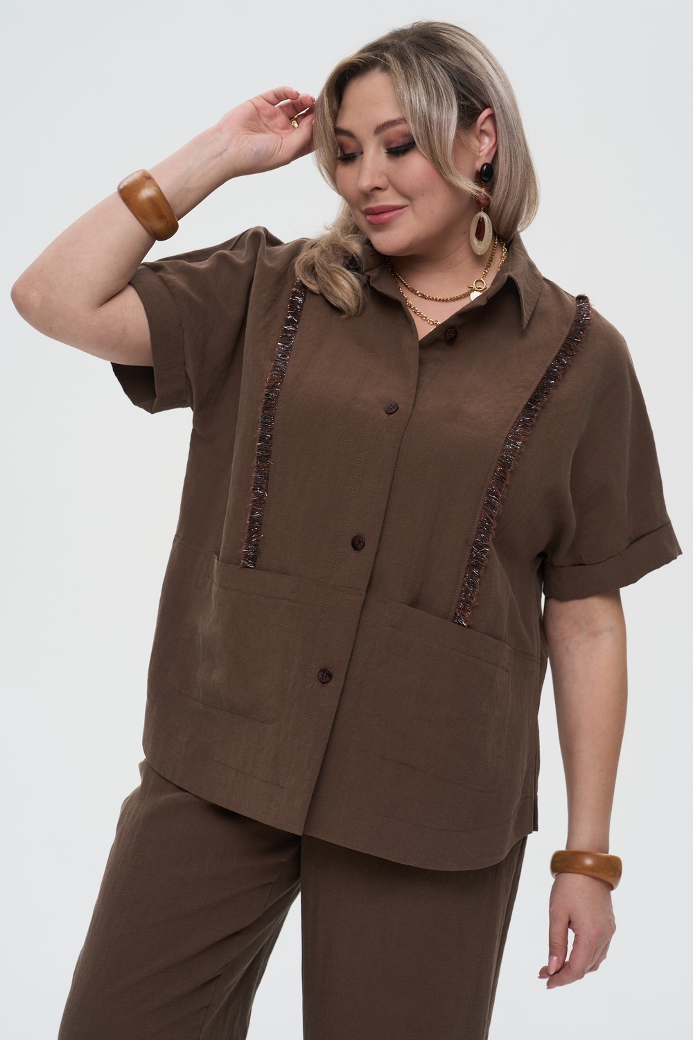 Описание: Женская разноцветная рубашка большого размера с гарфическим принтом СИМФОНИЯ бренда Интикома (Intikoma) - одежда для полных женщин. Контрастный рисунок в виде стилизованных пальмовых листьев на темном фоне придает изделию выразительность и позволяет легко комбинировать его с различными элементами гардероба. Рубашка свободного прямого кроя, застежка на пуговицах. Стильный комплект можно собрать с брюками МЕЛОМАН артикул 726010