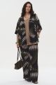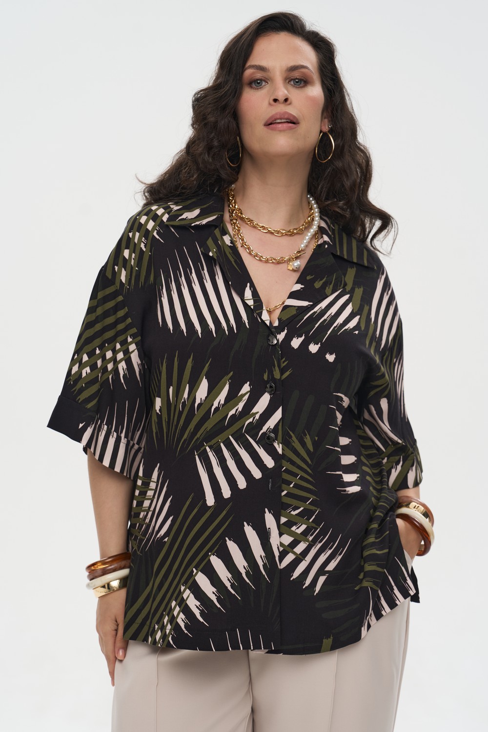 Женская разноцветная рубашка большого размера с гарфическим принтом СИМФОНИЯ бренда Интикома (Intikoma) - одежда для полных женщин. Контрастный рисунок в виде стилизованных пальмовых листьев на темном фоне придает изделию выразительность и позволяет легко комбинировать его с различными элементами гардероба. Рубашка свободного прямого кроя, застежка на пуговицах. Стильный комплект можно собрать с брюками МЕЛОМАН артикул 726010