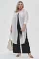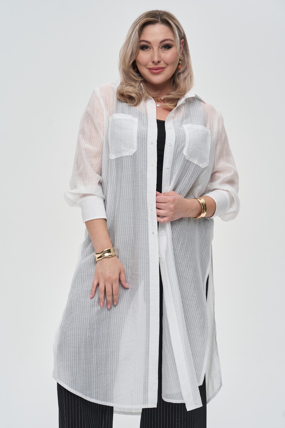 Описание: Женская удлиненная полупрозрачная белая рубашка большого размра ЧИНАЗЕС бренда Интикома (Intikoma) - одежда для полных женщин. Благодаря деликатной полупрозрачной фактуре в тонкую вертикальную полоску, рубашка выглядит невесомой и идеально подходит для создания многослойных образов в жаркую погоду. Центральная планка на пуговицах по всей длине передней полочки.