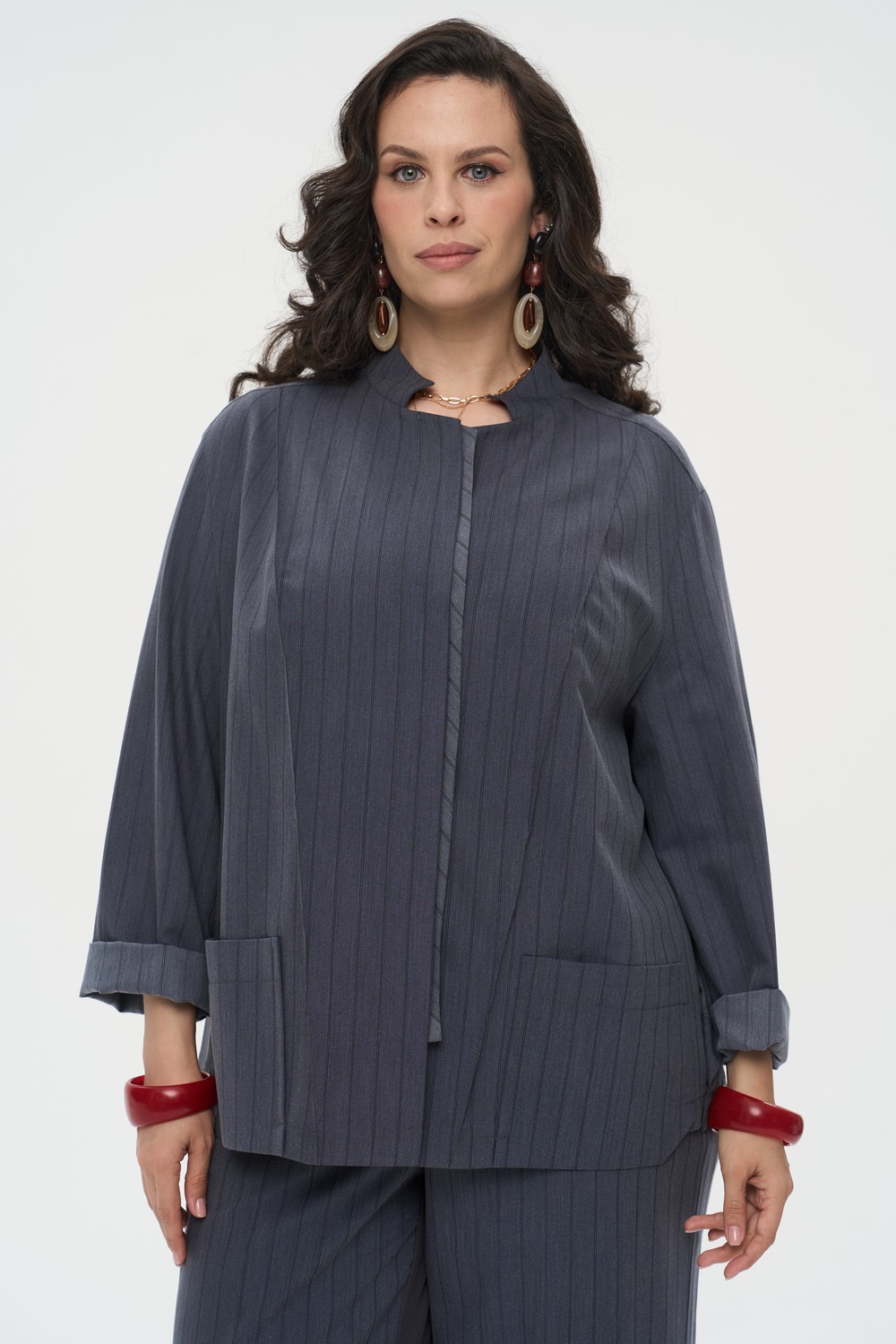 Женский темно-серый в тонкую полоску жакет большого размера бренда Интикома (Intikoma) - одежда для полных женщин. Жакет прямого свободного кроя. Лаконичная однобортная застежка на аккуратные пуговицы. Стильный кмплект можно собрать с брюками ФРИДОМ артикул 726009
